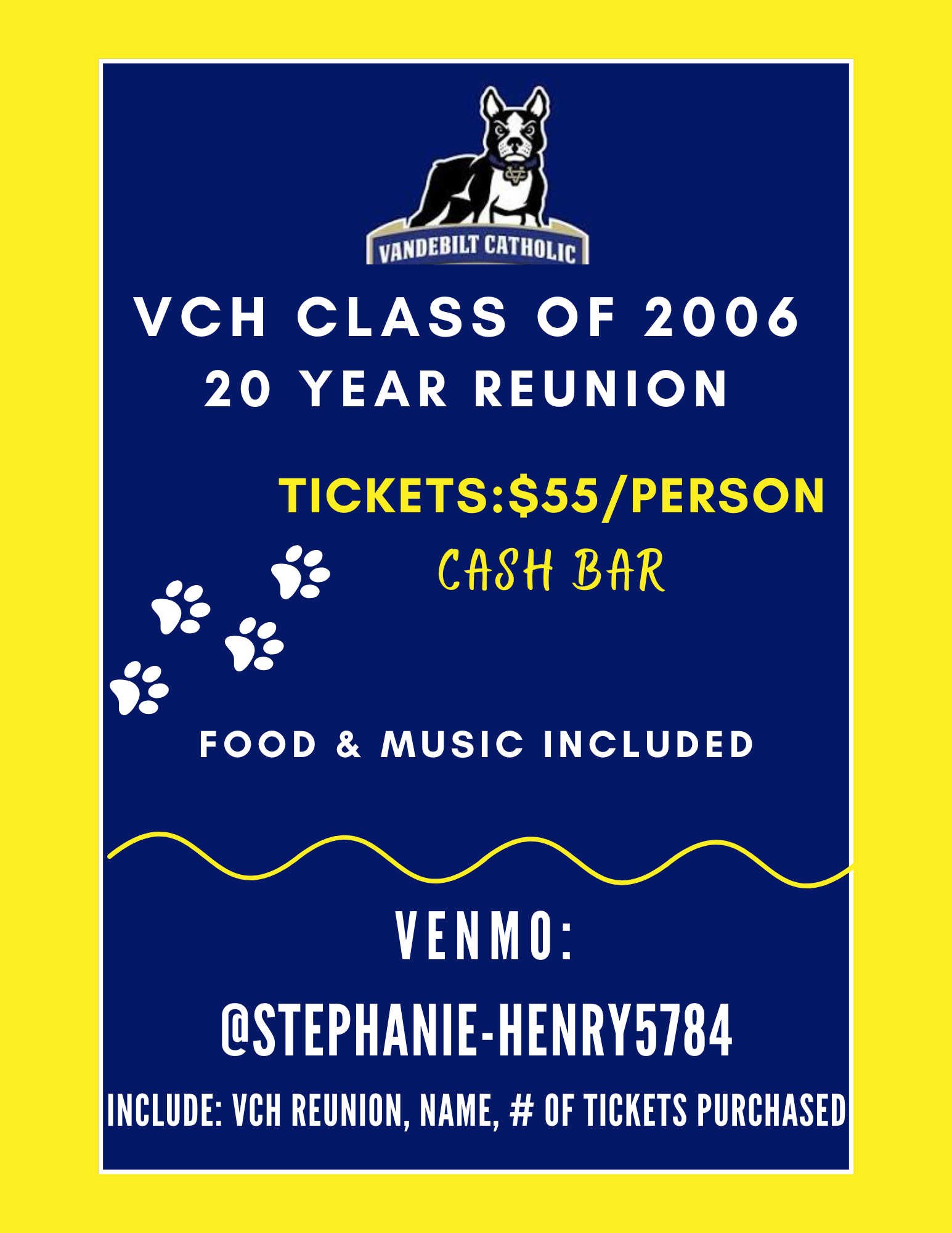 Tickets are $55/person. You can send Venmo to @Stephanie-Henry5784. Please include the following memo: VCH Reunion, Your Name, # of tickets purchased.